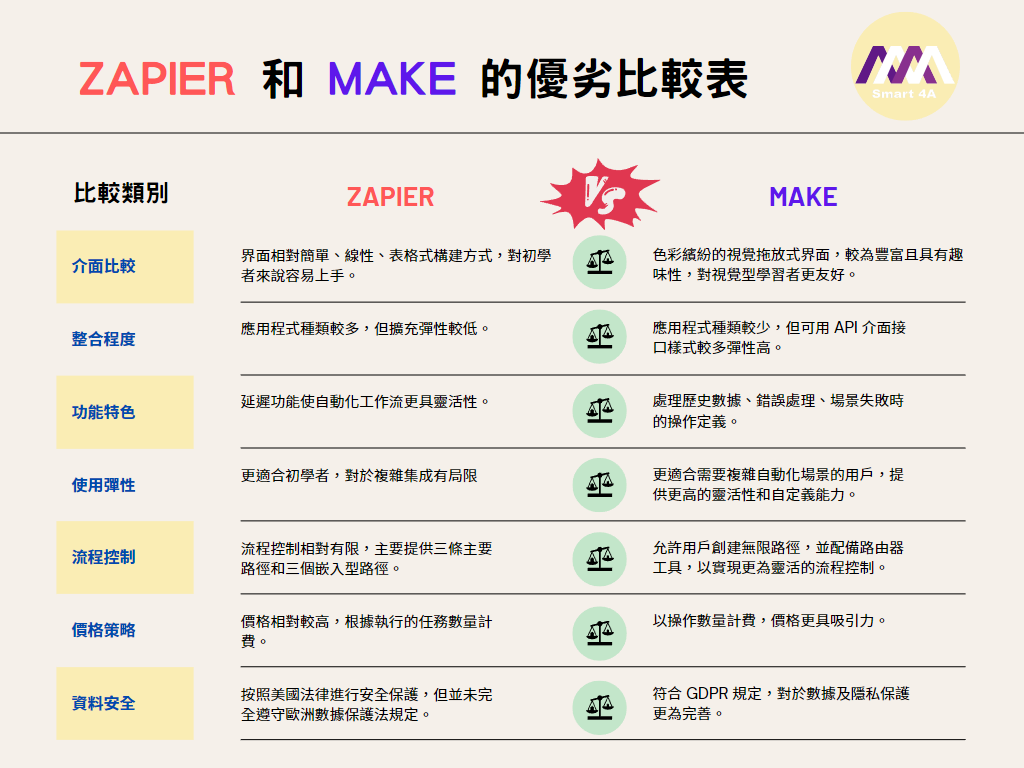 所以,Zapier 就像那個讓你生活輕鬆愉快的數位助手,而 Make 則是那個能讓你在自動化的舞台上展現精湛技藝的魔術師!我們可以從這七個方面來做比較,讓您更了解兩者的差異及用法:包括 1. 介面比較、2. 整合程度、3.功能特色、4. 使用彈性、5.流程控制、6.價格策略、7.資料安全:
