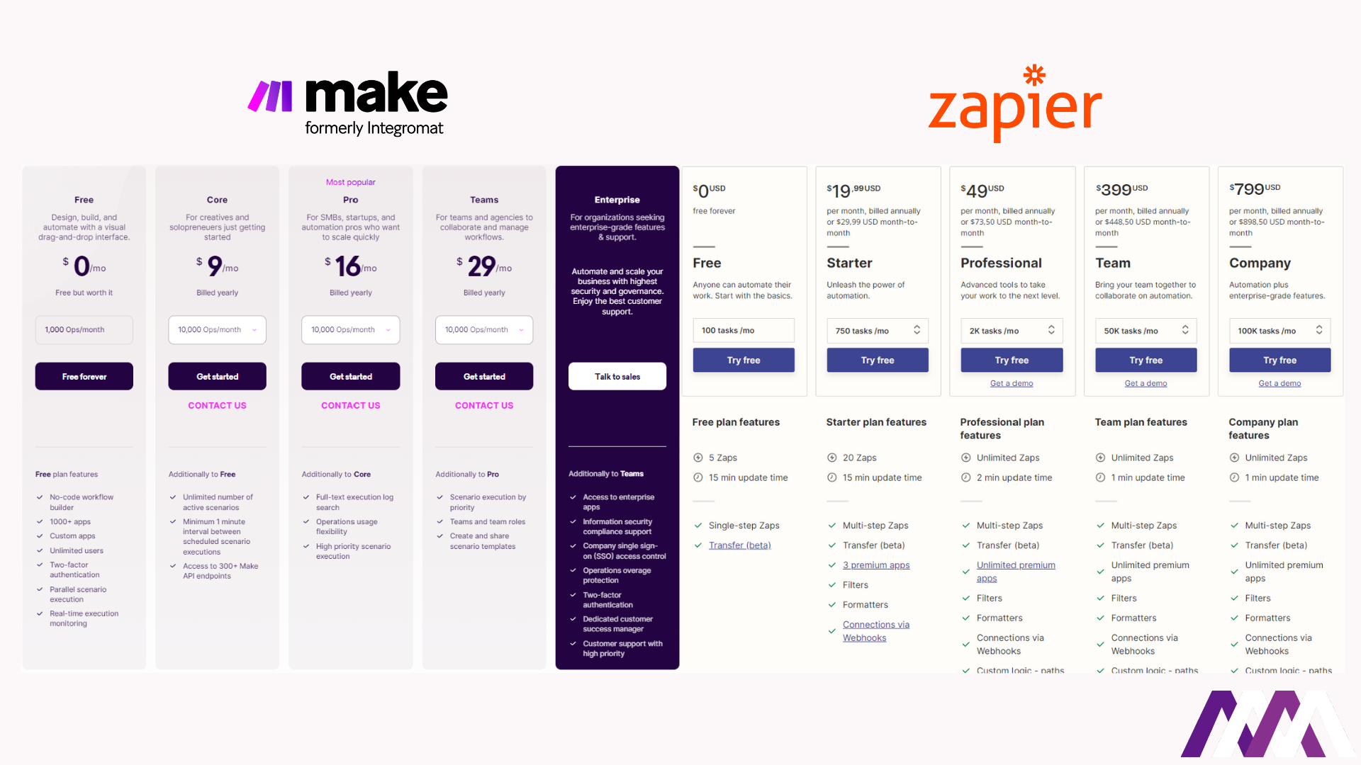 總之,Make 提供了更具成本效益的價格策略,按操作收費,而 Zapier 則在免費方案中提供檢查新數據的功能。